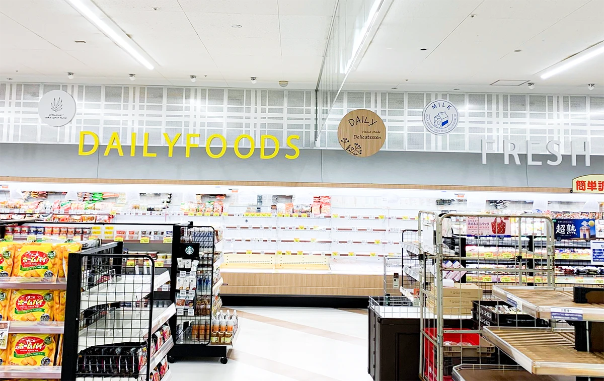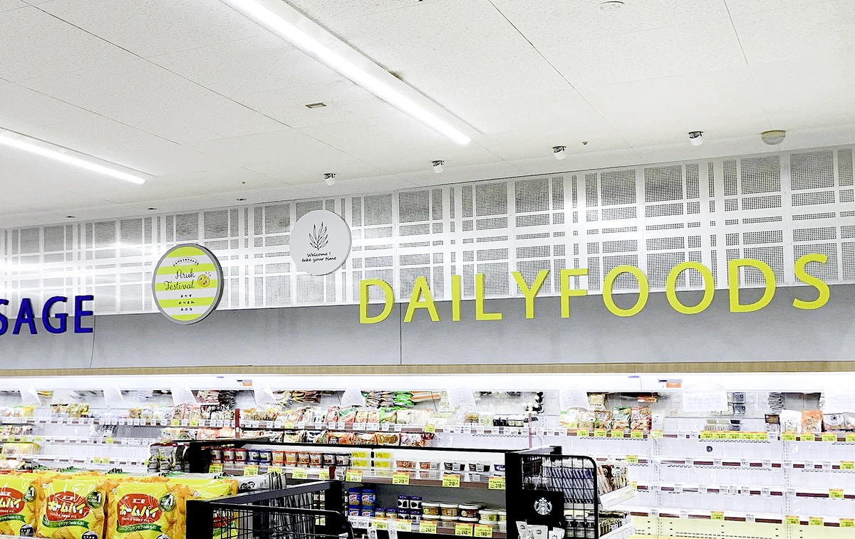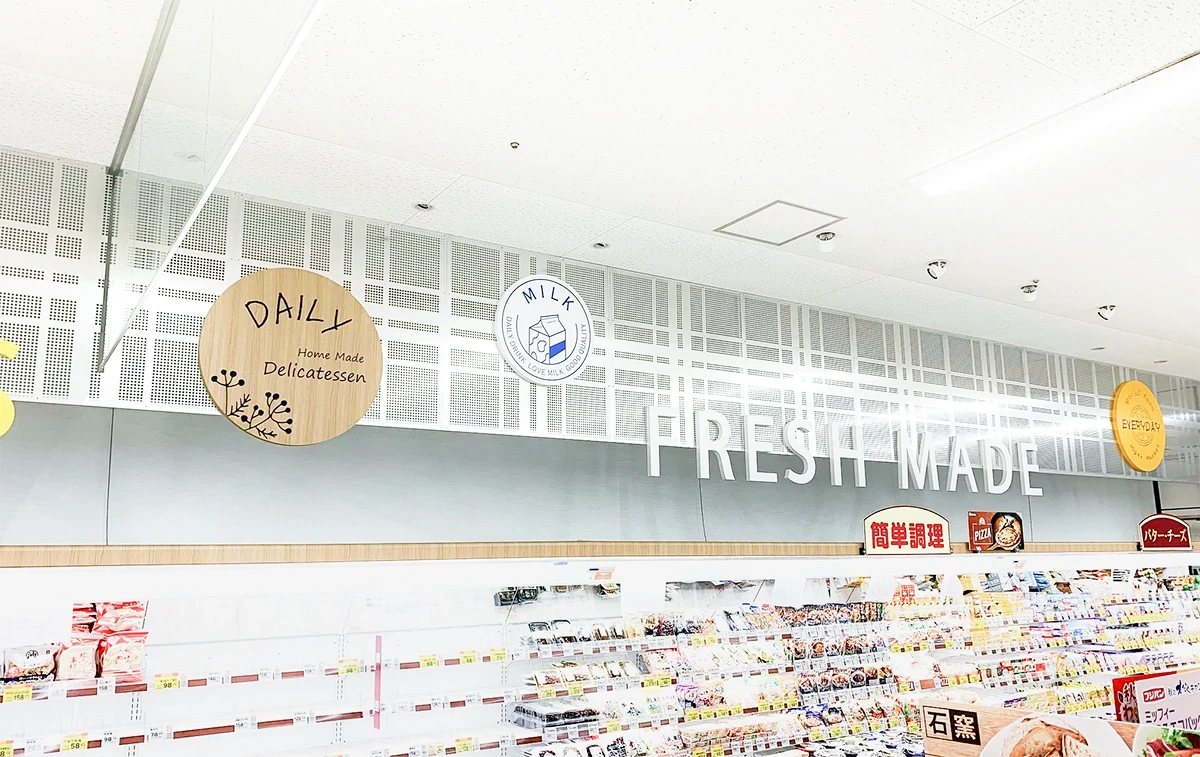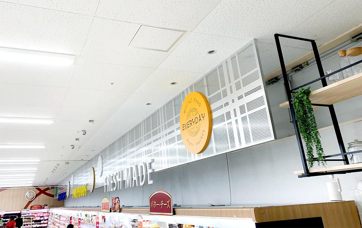 スーパーマーケットの内装に、フリー・アート・パーフォレーション® パターンシリーズ「タータンチェックのパンチングメタル パターンB」を採用いただきました。